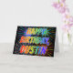 This vibrant, multicolored and fun birthday greeting card design features the message "HAPPY BIRTHDAY," and the common first name "DUSTIN" with the letters having a colourful rainbow spectrum like gradient colouring pattern. The background of the front also features a colourful bursting fireworks inspired pattern. The inside features a customisable greeting message, or could perhaps be cleared and left blank if a message is to be written by hand instead. This might be a fun way to acknowledge the birthday of somebody named Dustin. [~Z0000350]