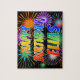 This fun, lively, birthday-themed jigsaw puzzle design has the message "HAPPY BIRTHDAY, ELIAS" having a colourful rainbow spectrum inspired gradient pattern, and a vibrant bursting celebratory fireworks inspired background pattern. An exciting puzzle like this might be a fun way to acknowledge the birthday of somebody named Elias. [~Z0000465]