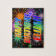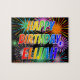 This lively and vibrant birthday-themed jigsaw puzzle design features the message "HAPPY BIRTHDAY, ELIJAH" having a colourful rainbow spectrum inspired gradient pattern, and a fun bursting celebratory fireworks inspired background pattern. A vibrant puzzle like this might be used to send a birthday greeting message to somebody named Elijah. [~Z0000465]