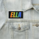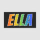 This fun, vibrant, multicolored name tag design features the common first name "ELLA", with the letters of the name having a colourful rainbow spectrum like gradient colouring pattern, on a black coloured background. A nametag like this might be worn by a volunteer, a customer service representative, or a staff member whose given name is Ella, to help identify the wearer to customers or other people. [~Z0000344]