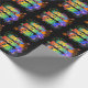 This lively and fun birthday-themed wrapping paper design has the message "HAPPY BIRTHDAY, EZRA" having a colourful rainbow spectrum inspired gradient pattern, and a vibrant bursting celebratory fireworks inspired background pattern. Vibrant wrapping paper like this might be used when wrapping presents being given in celebration of the birthday of somebody named Ezra. [~Z0000456]