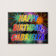 This exciting and vibrant birthday-themed jigsaw puzzle design has the message "HAPPY BIRTHDAY, GABRIELLA" having a colourful rainbow spectrum inspired gradient pattern, and a fun bursting celebratory fireworks inspired background pattern. A colourful puzzle like this might be used to send a birthday greeting message to somebody named Gabriella. [~Z0000465]