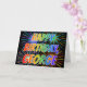 This fun, vibrant, multicolored birthday greeting card design features the message "HAPPY BIRTHDAY," and the common first name "GEORGE" with the letters having a colourful rainbow spectrum like gradient colouring pattern. The background of the front also features a colourful pattern inspired by the appearance of bursting celebratory fireworks. The inside features a customisable greeting message, or could perhaps be cleared and left blank if a message is to be written by hand instead. A greeting card like this could be a fun way to celebrate the birthday of somebody named George. [~Z0000350]