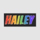 This fun, vibrant, multicolored name tag design features the common first name "HAILEY", with the letters of the name having a colourful rainbow spectrum like gradient colouring pattern, on a black coloured background. A nametag like this might be worn by a customer service representative, a volunteer, or an employee whose name is Hailey, to help identify the wearer to others. [~Z0000344]