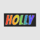 This fun, vibrant, multicolored name tag design features the common first name "HOLLY", with the letters of the name having a colourful rainbow spectrum like gradient colouring pattern, on a black coloured background. A nametag like this might be worn by an employee, a staff member, or a volunteer whose given name is Holly, to help identify the wearer to others. [~Z0000344]