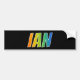 This fun, vibrant, multicolored bumper sticker design features the common first name "IAN" with the letters having a colourful rainbow spectrum like gradient colouring pattern. The background is coloured black. A bumper sticker like this might be a fun gift to give to somebody named Ian. [~Z0000343]