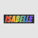 This fun, vibrant, multicolored name tag design features the common first name "ISABELLE", with the letters of the name having a colourful rainbow spectrum like gradient colouring pattern, on a black coloured background. A nametag like this might be worn by a staff member, a customer service representative, or an employee whose given name is Isabelle, to help identify the wearer to others. [~Z0000344]