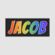 This fun, vibrant, multicolored name tag design features the common first name "JACOB", with the letters of the name having a colourful rainbow spectrum like gradient colouring pattern, on a black coloured background. A nametag like this might be worn by a volunteer, a staff member, or a customer service representative whose given name is Jacob, to help identify the wearer to customers or other people. [~Z0000344]
