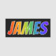 This fun, vibrant, multicolored name tag design features the common first name "JAMES", with the letters of the name having a colourful rainbow spectrum like gradient colouring pattern, on a black coloured background. A nametag like this might be worn by an employee, a customer service representative or a staff member who is named James, to help identify the wearer to others. [~Z0000344]