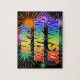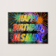 This vibrant and lively birthday-themed jigsaw puzzle design has the message "HAPPY BIRTHDAY, JASMINE" having a colorful rainbow spectrum inspired gradient pattern, and an exciting bursting celebratory fireworks inspired background pattern. An exciting puzzle like this might be a fun way to send birthday wishes to somebody named Jasmine. [~Z0000465]