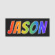 This fun, vibrant, multicolored name tag design features the common first name "JASON", with the letters of the name having a colourful rainbow spectrum like gradient colouring pattern, on a black coloured background. A nametag like this might be worn by a staff member, a volunteer, or a customer service representative whose name is Jason, to help identify the wearer to others. [~Z0000344]