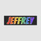 This fun, vibrant, multicolored name tag design features the common first name "JEFFREY", with the letters of the name having a colourful rainbow spectrum like gradient colouring pattern, on a black coloured background. A nametag like this might be worn by a volunteer, an employee, or a customer service representative whose name is Jeffrey, to help identify the wearer to others. [~Z0000344]
