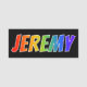 This fun, vibrant, multicolored name tag design features the common first name "JEREMY", with the letters of the name having a colourful rainbow spectrum like gradient colouring pattern, on a black coloured background. A nametag like this might be worn by a customer service representative, a staff member, or an employee whose first name is Jeremy, to help identify the wearer to customers or other people. [~Z0000344]