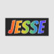 This fun, vibrant, multicolored name tag design features the common first name "JESSE", with the letters of the name having a colourful rainbow spectrum like gradient colouring pattern, on a black coloured background. A nametag like this might be worn by an employee, a customer service representative, or a staff member named Jesse, to help identify the wearer to others. [~Z0000344]