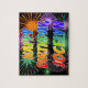 This vibrant and fun birthday-themed jigsaw puzzle design has the message "HAPPY BIRTHDAY, JOCELYN" having a colourful rainbow spectrum inspired gradient pattern, and an exciting bursting celebratory fireworks inspired background pattern. An exciting puzzle like this might be used to send birthday greetings to somebody named Jocelyn. [~Z0000465]