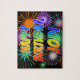 This exciting, lively, birthday-themed jigsaw puzzle design has the message "HAPPY BIRTHDAY, JODI" having a colourful rainbow spectrum inspired gradient pattern, and a vibrant bursting celebratory fireworks inspired background pattern. An exciting puzzle like this might be a fun way to acknowledge the birthday of somebody named Jodi. [~Z0000465]