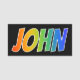This fun, vibrant, multicolored name tag design features the common first name "JOHN", with the letters of the name having a colourful rainbow spectrum like gradient colouring pattern, on a black coloured background. A nametag like this might be worn by a volunteer, an employee, or a staff member named John, to help identify the wearer to others. [~Z0000344]