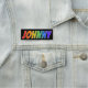 This fun, vibrant, multicolored name tag design features the common first name "JOHNNY", with the letters of the name having a colourful rainbow spectrum like gradient colouring pattern, on a black coloured background. A nametag like this might be worn by a staff member, a volunteer, or a customer service representative whose name is Johnny, to help identify the wearer to customers or other people. [~Z0000344]