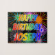 This fun, exciting, birthday-themed jigsaw puzzle design has the message "HAPPY BIRTHDAY, JOSEPH" having a colourful rainbow spectrum inspired gradient pattern, and a lively bursting celebratory fireworks inspired background pattern. An exciting puzzle like this might be a fun way to send birthday wishes to somebody named Joseph. [~Z0000465]