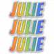 This vibrant, multicolored, and fun sticker design features the common first name or given name "JULIE", with the letters of the name featuring a colourful rainbow spectrum inspired gradient colouring pattern. It might be a fun present to give to somebody who is named Julie. [~Z0000361]