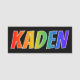 This fun, vibrant, multicolored name tag design features the common first name "KADEN", with the letters of the name having a colourful rainbow spectrum like gradient colouring pattern, on a black coloured background. A nametag like this might be worn by a volunteer, a customer service representative, or an employee whose name is Kaden, to help identify the wearer to customers or other people. [~Z0000344]