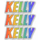 This multicolored, fun, and vibrant sticker design features the common first name or given name "KELLY", with the letters of the name having a colourful rainbow spectrum like gradient colouring pattern. It might be a fun present to give to somebody who is named Kelly. [~Z0000361]