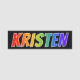 This fun, vibrant, multicolored name tag design features the common first name "KRISTEN", with the letters of the name having a colourful rainbow spectrum like gradient colouring pattern, on a black coloured background. A nametag like this might be worn by a staff member, an employee, or a volunteer named Kristen, to help identify the wearer to customers or other people. [~Z0000344]