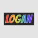 This fun, vibrant, multicolored name tag design features the common first name "LOGAN", with the letters of the name having a colourful rainbow spectrum like gradient colouring pattern, on a black coloured background. A nametag like this might be worn by a customer service representative, a volunteer, or an employee whose name is Logan, to help identify the wearer to others. [~Z0000344]