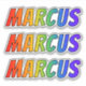 This vibrant, fun, and exciting sticker design features the common first name or given name "MARCUS", with the letters of the name having a colourful rainbow spectrum inspired gradient colouring pattern. It might be a fun gift to give to somebody named Marcus. [~Z0000361]