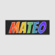 This fun, vibrant, multicolored name tag design features the common first name "MATEO", with the letters of the name having a colourful rainbow spectrum like gradient colouring pattern, on a black coloured background. A nametag like this might be worn by a staff member, a volunteer, or a customer service representative whose first name is Mateo, to help identify the wearer to others. [~Z0000344]