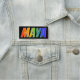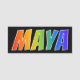 This fun, vibrant, multicolored name tag design features the common first name "MAYA", with the letters of the name having a colourful rainbow spectrum like gradient colouring pattern, on a black coloured background. A nametag like this might be worn by a customer service representative, a volunteer, or an employee named Maya, to help identify the wearer to others. [~Z0000344]