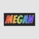 This fun, vibrant, multicolored name tag design features the common first name "MEGAN", with the letters of the name having a colourful rainbow spectrum like gradient colouring pattern, on a black coloured background. A nametag like this might be worn by a volunteer, a customer service representative, or an employee whose first name is Megan, to help identify the wearer to customers or other people. [~Z0000344]