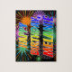 This exciting, vibrant, birthday-themed jigsaw puzzle design has the message "HAPPY BIRTHDAY, MELANIE" having a colourful rainbow spectrum inspired gradient pattern, and a lively bursting celebratory fireworks inspired background pattern. A colourful puzzle like this might be a fun way to send birthday greetings to somebody named Melanie. [~Z0000465]