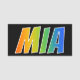 This fun, vibrant, multicolored name tag design features the common first name "MIA", with the letters of the name having a colourful rainbow spectrum like gradient colouring pattern, on a black coloured background. A nametag like this might be worn by an employee, a staff member, or a volunteer whose name is Mia, to help identify the wearer to customers or other people. [~Z0000344]