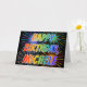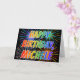 This vibrant, multicolored and fun birthday greeting card design features the message "HAPPY BIRTHDAY," and the common first name "MICHELE" with the letters having a colorful rainbow spectrum like gradient coloring pattern. The background of the front also features a colorful pattern inspired by the appearance of bursting fireworks. The inside features a personalized greeting message, or could perhaps be cleared and left blank if a message is to be written by hand instead. A birthday greeting card like this might be a fun way to acknowledge the birthday of somebody named Michele. [~Z0000350]
