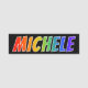 This fun, vibrant, multicolored name tag design features the common first name "MICHELE", with the letters of the name having a colourful rainbow spectrum like gradient colouring pattern, on a black coloured background. A nametag like this might be worn by a staff member, an employee, or a customer service representative named Michele, to help identify the wearer to others. [~Z0000344]