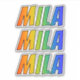 This vibrant, exciting, and fun sticker design features the common first name or given name "MILA", with the letters of the name featuring a colourful rainbow spectrum inspired gradient colouring pattern. It might be a fun present to give to somebody named Mila. [~Z0000361]