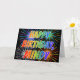 This multicolored and fun birthday greeting card design features the message "HAPPY BIRTHDAY," and the common first name "MINDY" with the letters having a colourful rainbow spectrum like gradient colouring pattern. The background of the front also features a colourful bursting fireworks inspired pattern. The inside features a customisable greeting message, or could perhaps be cleared and left blank if a message is to be written by hand instead. A birthday greeting card like this might be a fun way to acknowledge the birthday of somebody named Mindy. [~Z0000350]