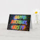 This multicolored and fun birthday greeting card design features the message "HAPPY BIRTHDAY," and the common first name "MISTY" with the letters having a colourful rainbow spectrum like gradient colouring pattern. The background of the front also features a colourful pattern inspired by the appearance of bursting fireworks. The inside features a personalised greeting message, or could perhaps be cleared and left blank if a message is to be written by hand instead. A greeting card like this might be a fun way to send a personalised birthday message to somebody named Misty. [~Z0000350]