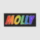 This fun, vibrant, multicolored name tag design features the common first name "MOLLY", with the letters of the name having a colourful rainbow spectrum like gradient colouring pattern, on a black coloured background. A nametag like this might be worn by a staff member, a customer service representative, or a volunteer named Molly, to help identify the wearer to customers or other people. [~Z0000344]