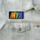 This fun, vibrant, multicolored name tag design features the common first name "MYA", with the letters of the name having a colourful rainbow spectrum like gradient colouring pattern, on a black coloured background. A nametag like this might be worn by a volunteer, a staff member, or an employee who is named Mya, to help identify the wearer to customers or other people. [~Z0000344]