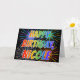 This fun, vibrant, multicolored birthday greeting card design features the message "HAPPY BIRTHDAY," and the common first name "NICOLE" with the letters having a colourful rainbow spectrum like gradient colouring pattern. The background of the front also features a colourful pattern inspired by the look of bursting celebratory fireworks. The inside features a personalised greeting message, or could perhaps be cleared and left blank if a message is to be written by hand instead. A greeting card like this might be a fun way to send a personalised birthday message to somebody named Nicole. [~Z0000350]