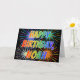 This fun, vibrant, multicolored birthday greeting card design features the message "HAPPY BIRTHDAY," and the common first name "NOAH" with the letters having a colourful rainbow spectrum like gradient colouring pattern. The background of the front also features a colourful bursting fireworks inspired pattern. The inside features a custom greeting message, or could perhaps be cleared and left blank if a message is to be written by hand instead. A greeting card like this might be a fun way to send a personalised birthday message to somebody named Noah. [~Z0000350]