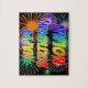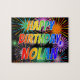 This vibrant and exciting birthday-themed jigsaw puzzle design features the message "HAPPY BIRTHDAY, NOLAN" having a colourful rainbow spectrum inspired gradient pattern, and a lively bursting celebratory fireworks inspired background pattern. A vibrant puzzle like this might be used to send a birthday greeting message to somebody named Nolan. [~Z0000465]