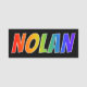 This fun, vibrant, multicolored name tag design features the common first name "NOLAN", with the letters of the name having a colourful rainbow spectrum like gradient colouring pattern, on a black coloured background. A nametag like this might be worn by an employee, a customer service representative, or a volunteer whose given name is Nolan, to help identify the wearer to others. [~Z0000344]