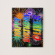 This vibrant and lively birthday-themed jigsaw puzzle design features the message "HAPPY BIRTHDAY, OLIVER" having a colourful rainbow spectrum inspired gradient pattern, and a fun bursting celebratory fireworks inspired background pattern. A vibrant puzzle like this might be used to send birthday wishes to somebody named Oliver. [~Z0000465]