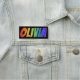 This fun, vibrant, multicolored name tag design features the common first name "OLIVIA", with the letters of the name having a colourful rainbow spectrum like gradient colouring pattern, on a black coloured background. A nametag like this might be worn by a staff member, a volunteer, or an employee named Olivia, to help identify the wearer to others. [~Z0000344]
