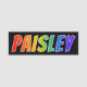 This fun, vibrant, multicolored name tag design features the common first name "PAISLEY", with the letters of the name having a colourful rainbow spectrum like gradient colouring pattern, on a black coloured background. A nametag like this might be worn by a staff member, a volunteer, or a customer service representative who is named Paisley, to help identify the wearer to others. [~Z0000344]
