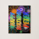 This fun, vibrant, birthday-themed jigsaw puzzle design features the message "HAPPY BIRTHDAY, PETER" having a colourful rainbow spectrum inspired gradient pattern, and a lively bursting celebratory fireworks inspired background pattern. A colourful puzzle like this might be used to send a birthday greeting message to somebody named Peter. [~Z0000465]