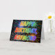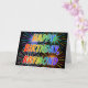 This vibrant, multicolored and fun birthday greeting card design features the message "HAPPY BIRTHDAY," and the common first name "RAYMOND" with the letters having a colourful rainbow spectrum like gradient colouring pattern. The background of the front also features a colourful bursting fireworks inspired pattern. The inside features a custom greeting message, or could perhaps be cleared and left blank if a message is to be written by hand instead. A greeting card like this might be a fun way to send a personalised birthday message to somebody named Raymond. [~Z0000350]